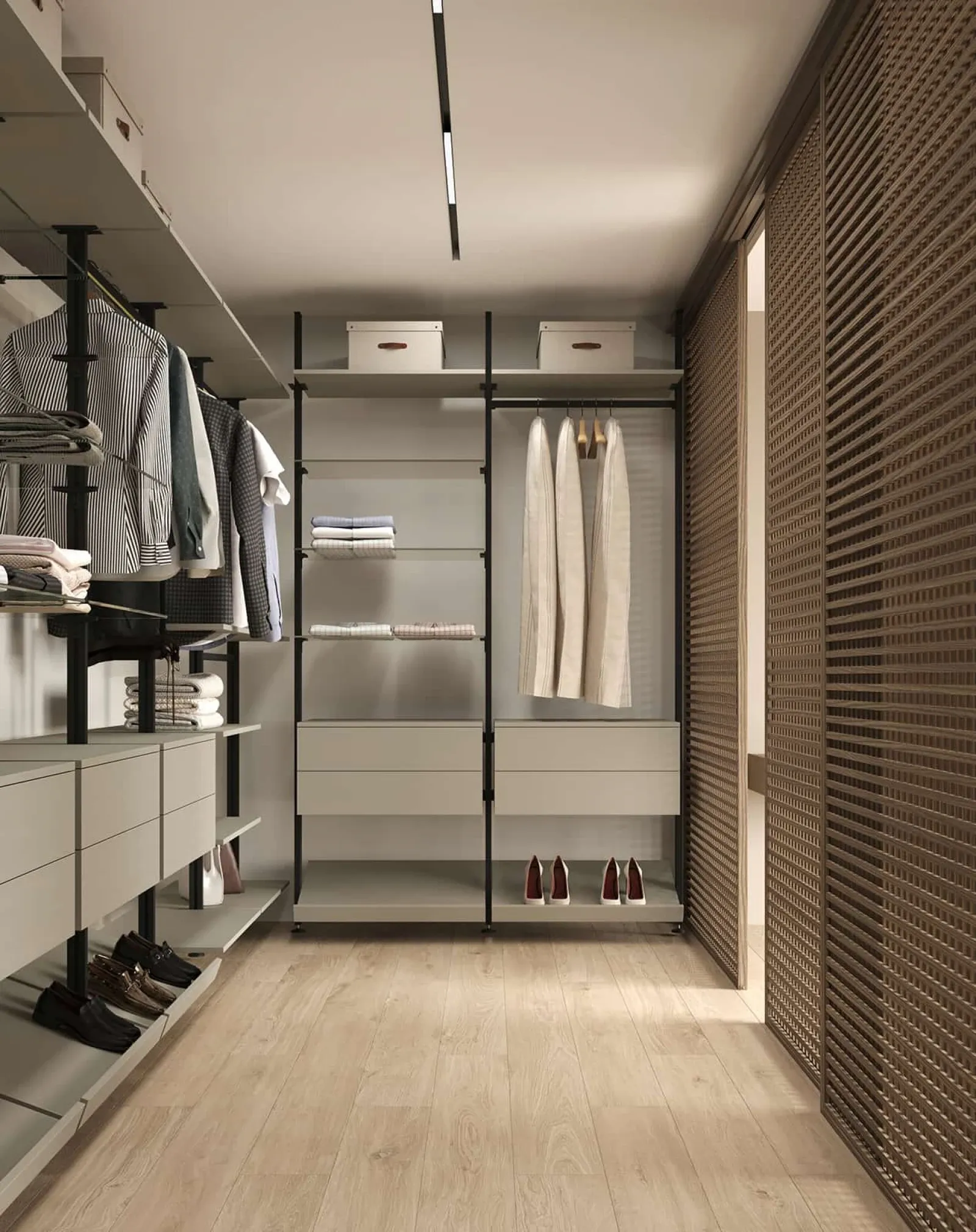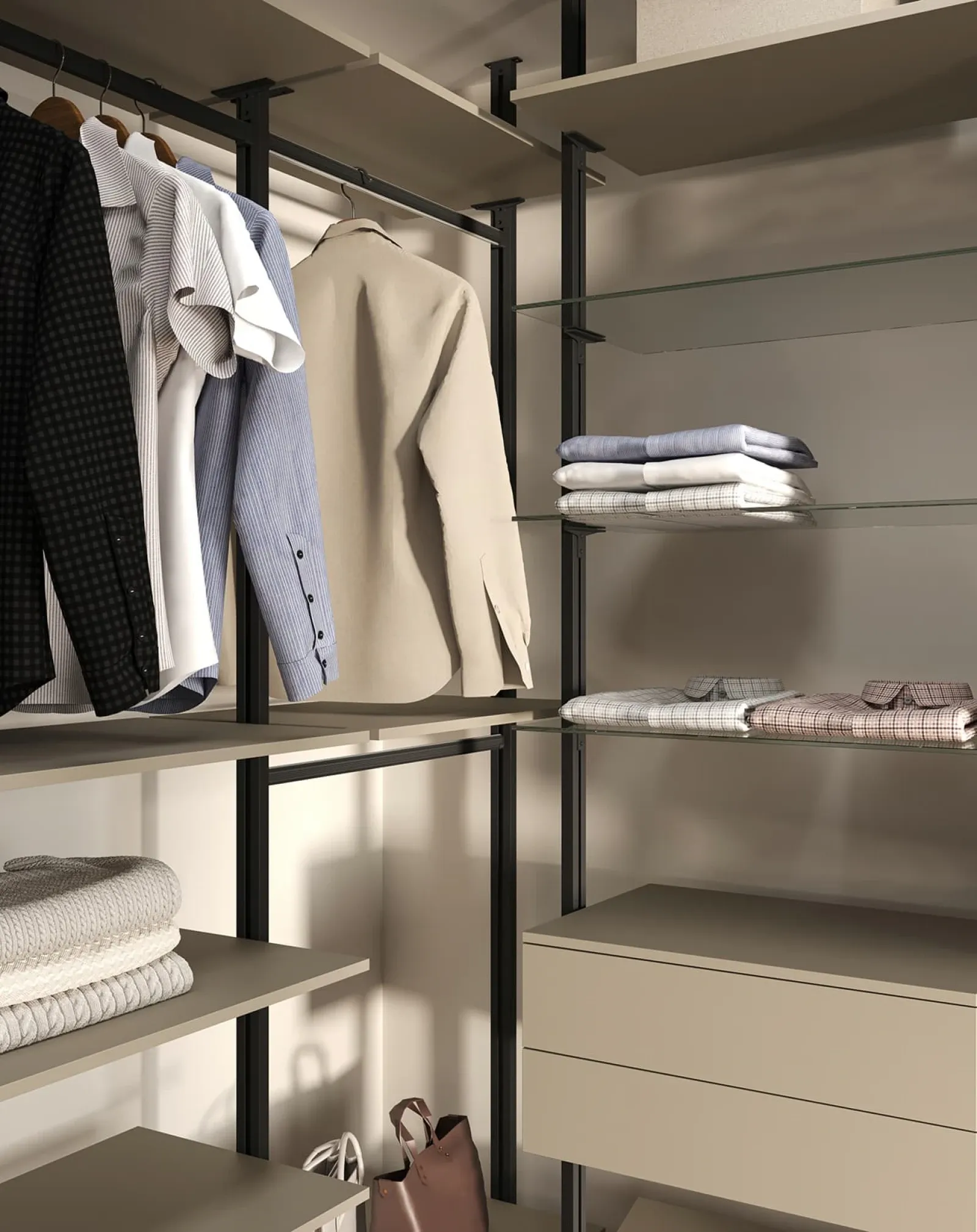 ОПОРНЫЙ ПРОФИЛЬ PA 02, цвет Черный Матовый НАВЕСНЫЕ ЭЛЕМЕНТЫ ЛМДФ SUPRAMAT (толщина 18 мм), цвет Сафари Супрамат, стекло прозрачное (толщина 6 мм)