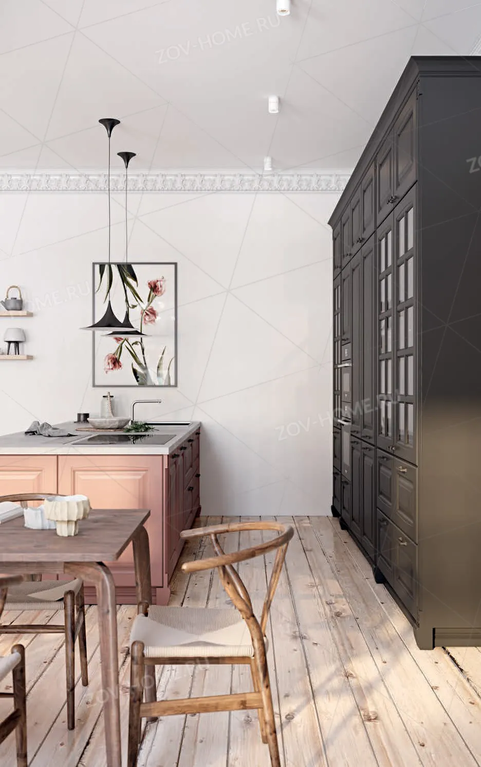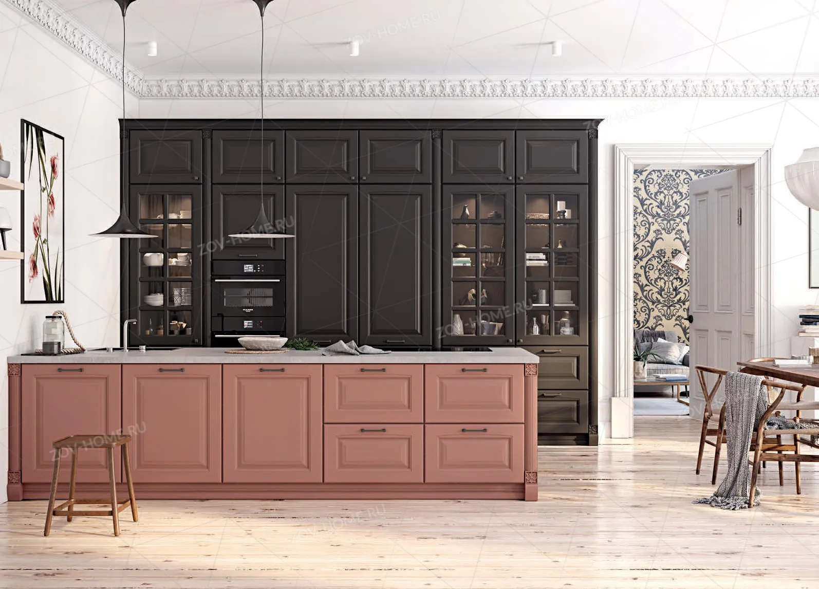 Цоколь: Декоративный #2 (декоративная планка гладкая), МДФ / шпон ясеня / массив ясеня, цвет NCS S 8000-N (без патины) / NCS S 3030-Y90R (без патины), высота 97 мм