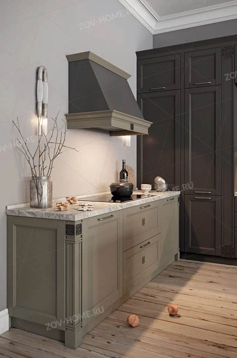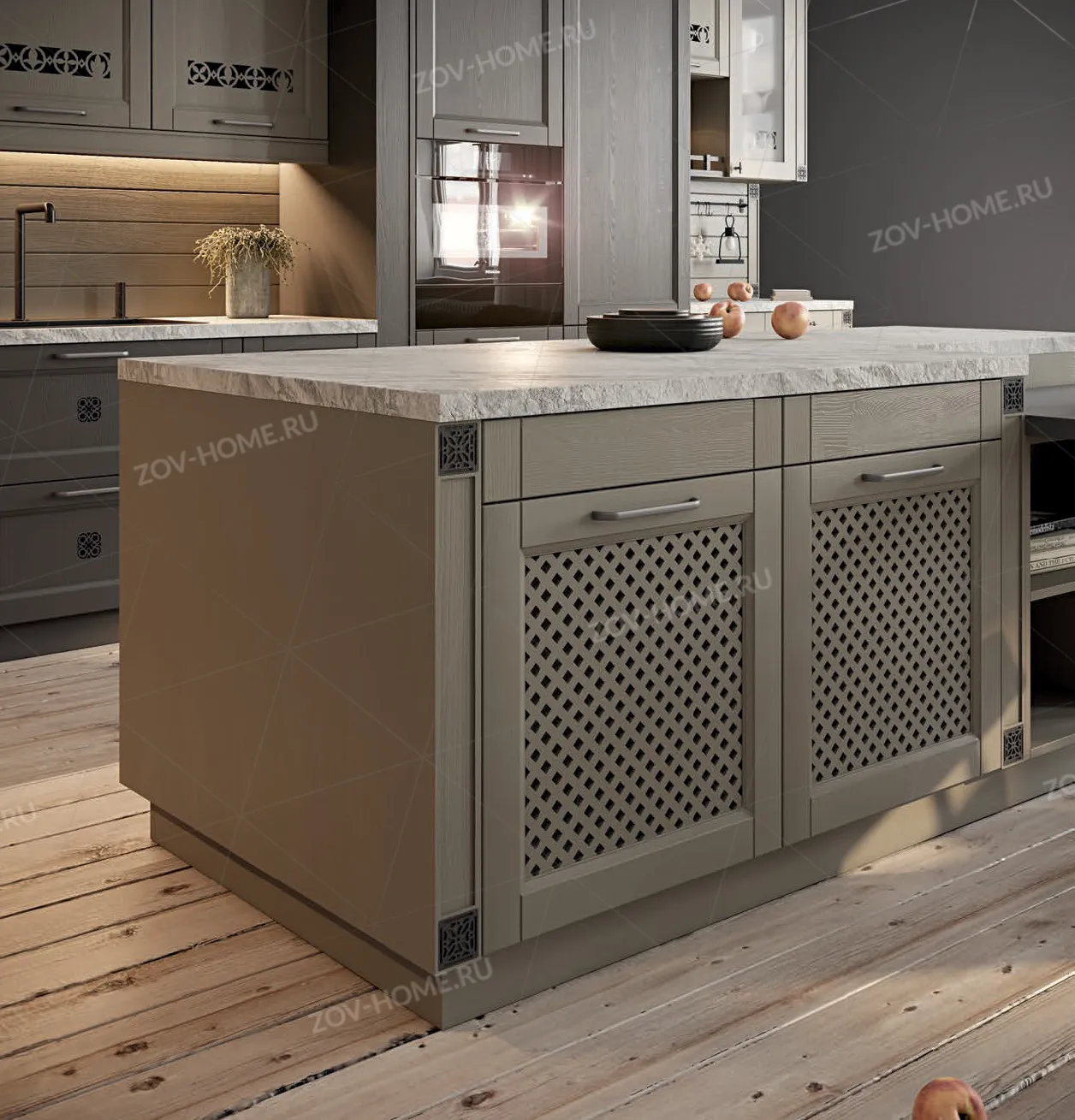 Декоративные элементы: Опора декоративная ОД-10 (820), цвет вставки 120; панель декоративная БПД-10-1; пилястра #13, цвет вставки 120; балюстрада прямая «Техно»; плинтус мебельный ПМ-5; багет ЛГБ-1 прямой; вагонка, цвет NCS S 6005-G80Y; декоративный короб HB «Пьемонт» (900) под встраиваемую вытяжку, цвет купола / вставки 120