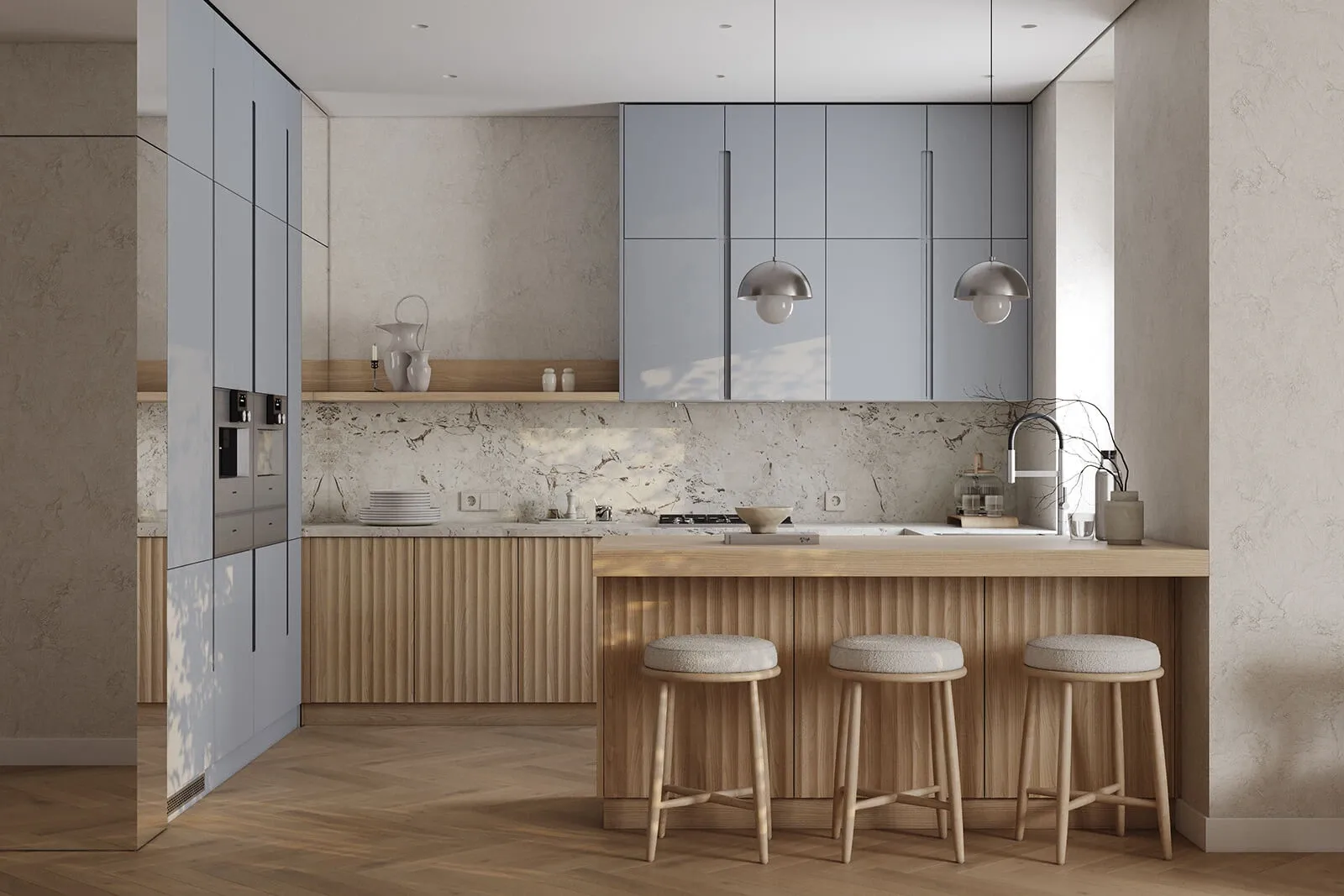 Фасады: T443 Шпон дуба, цвет #189 (воскобейц Белый) / Т622 Крашеная МДФ, цвет NCS S 2010-R90B Матовый