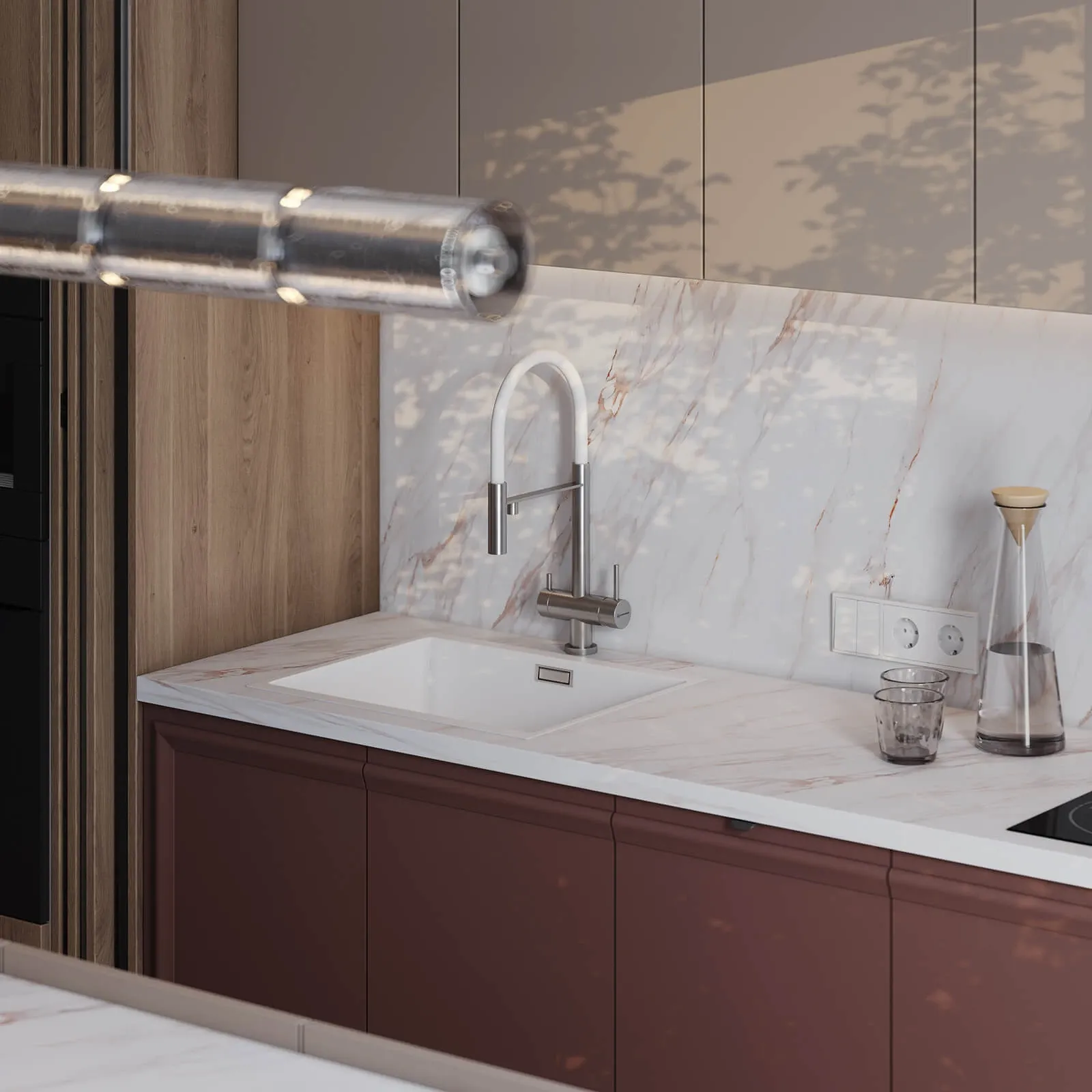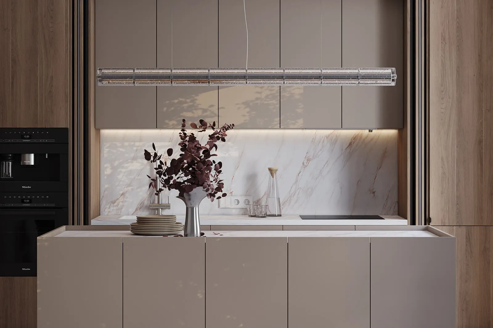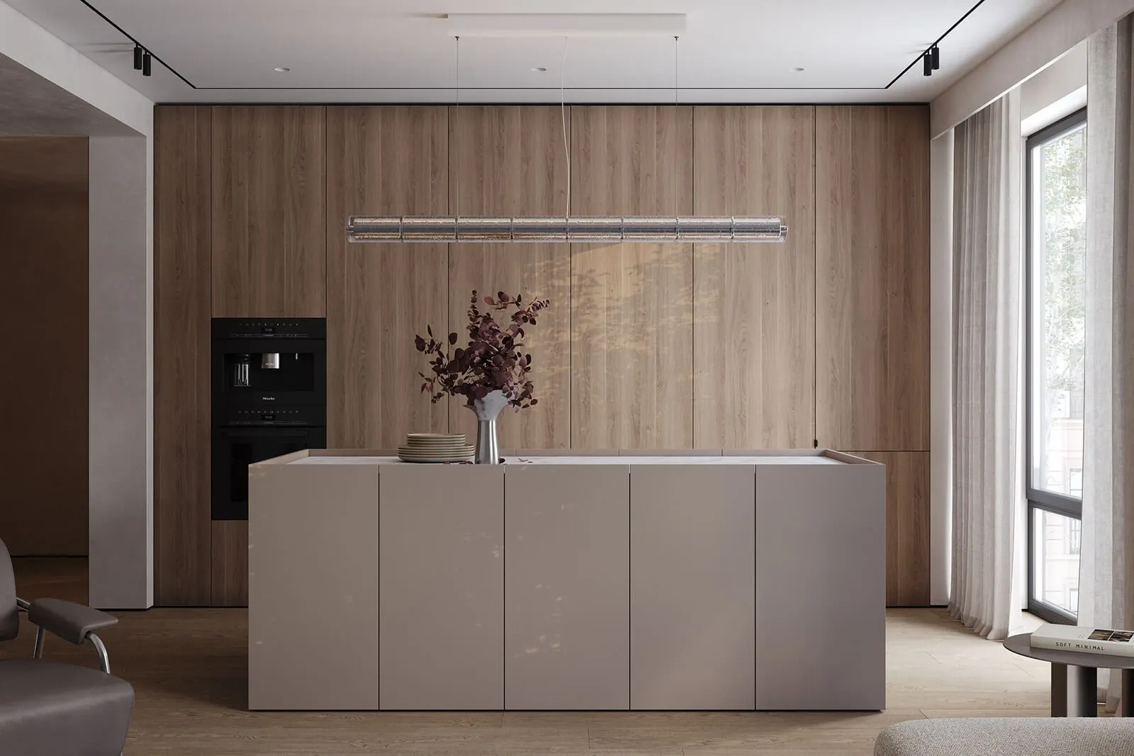 Фасады: ЛМДФ SUPRAMAT, цвет Сафари Супрамат / ЛМДФ Тимбер, декор Кунео Коричневый / Т651 Крашеная МДФ, цвет NCS S 6020-R Матовый