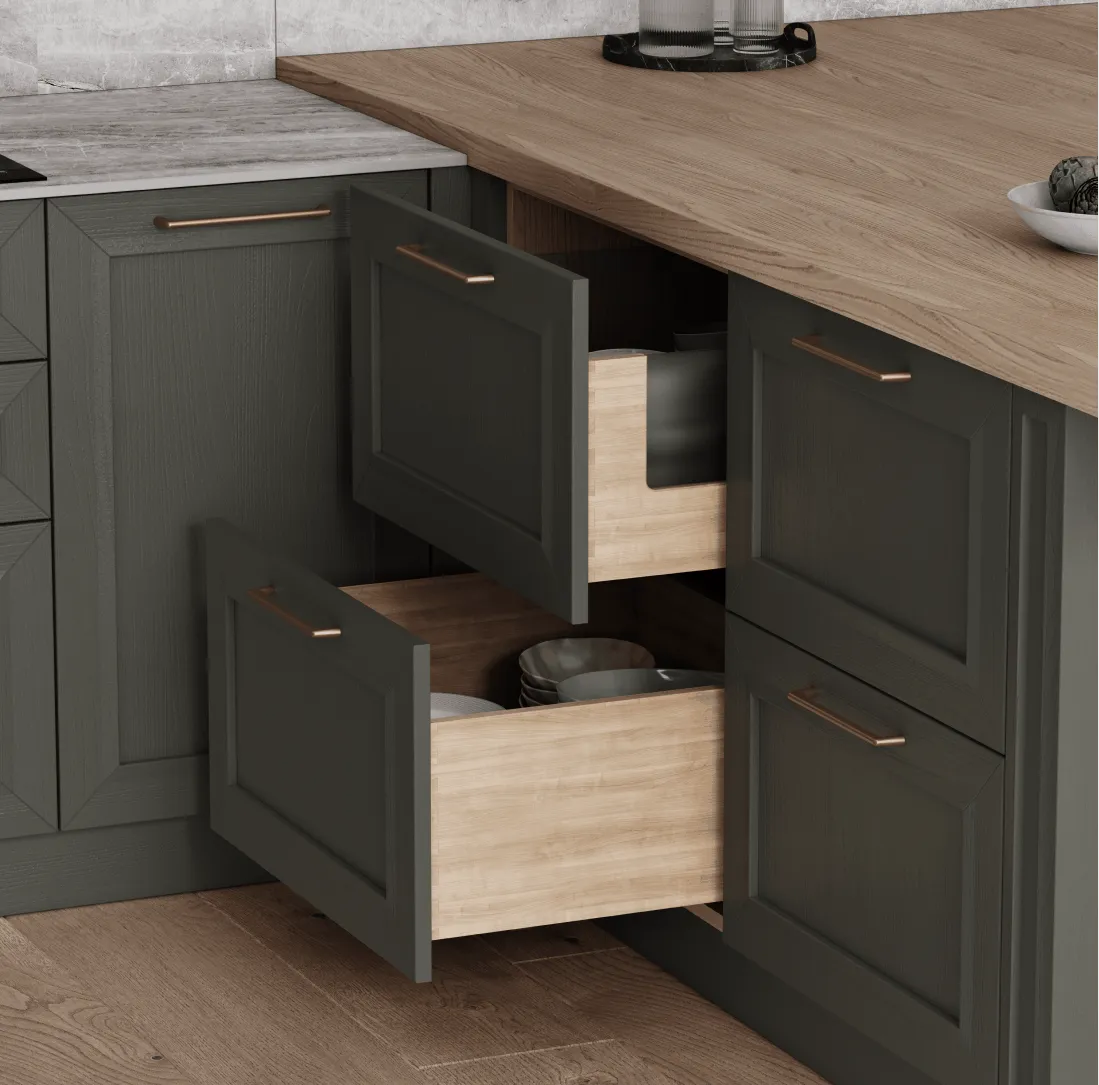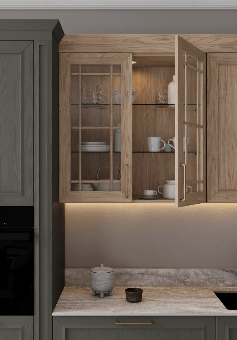 Механизмы открывания: петли Sensys (Hettich), направляющие Legrabox (Blum) цвет серый орион, выдвижные ящики из натурального дерева цвет#183 с направляющими Quadro 25 частичного выдвижения со встроенным демпфером Silent System со стеклом сатин матовый, CornerStone 450 (Vauth-Sagel)