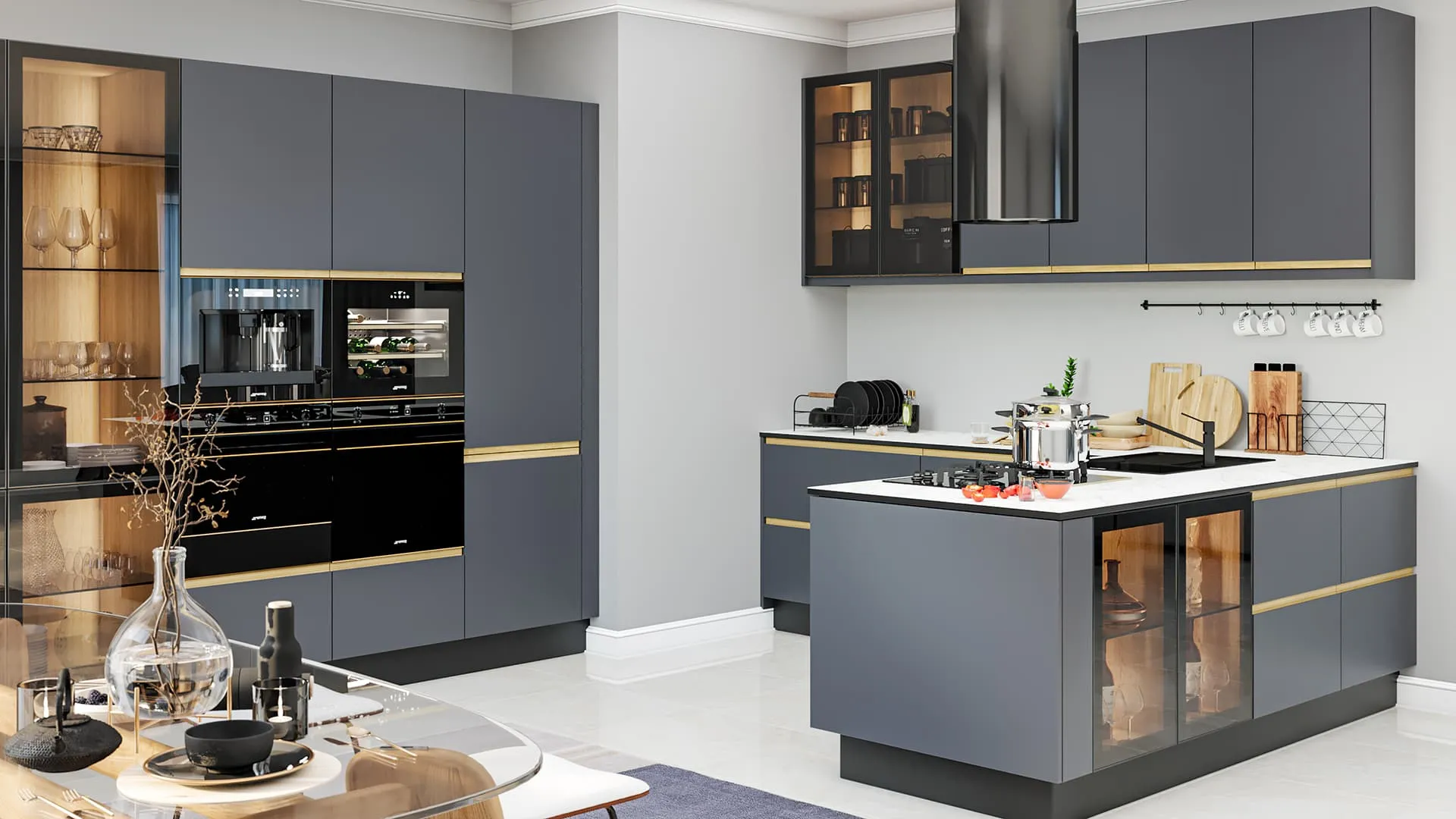 Фасады: МДФ эмаль Т640Я КВ-1 RAL 7015 мат. + планка из массива цвет 182, А-3 Черный браш.