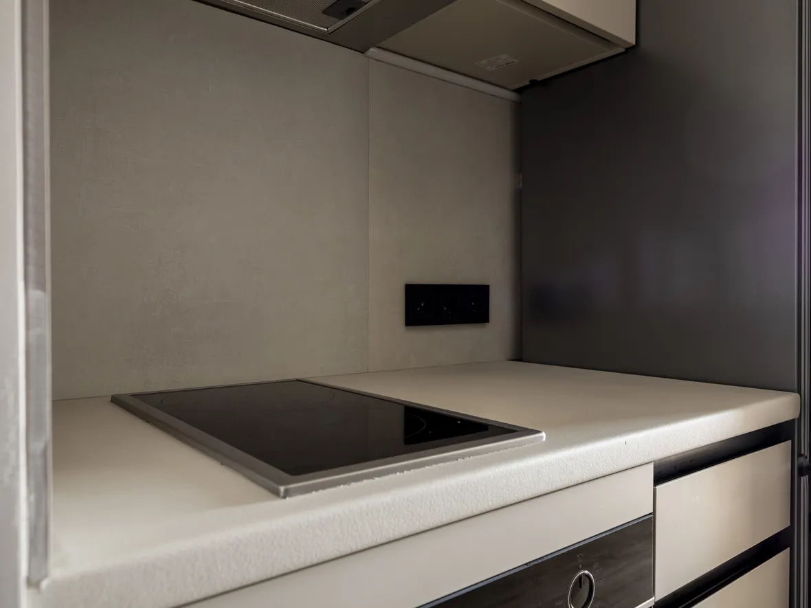 Техника: мойка и смеситель - EMAR, измельчитель - BONE CRUSHER, встроенный духовой шкаф, встроенная электрическая варочная панель, встроенная СВЧ, встроенная вытяжка, встроенная ПММ, встроенный холодильник - KORTING